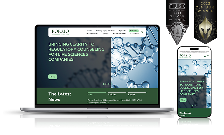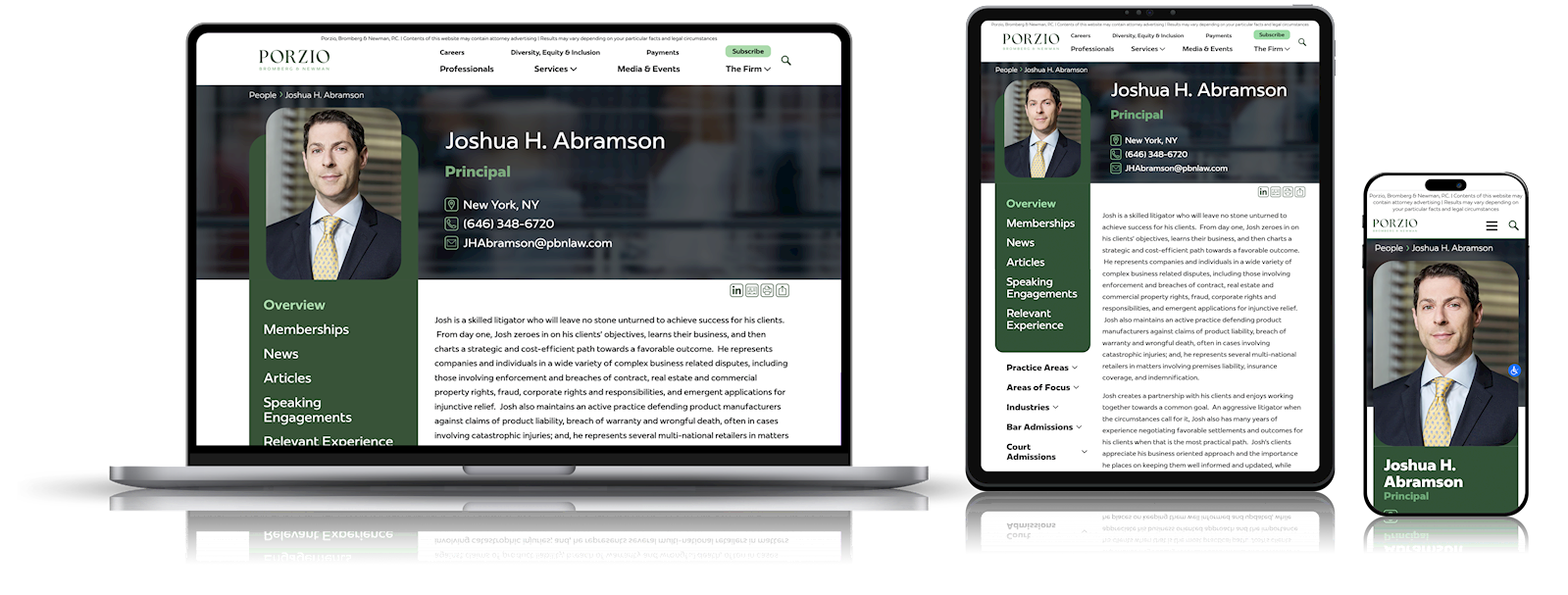 The revamped website marks a departure from the competitive norm. Porzio Bromberg & Newman's site mirrors the brand's prowess in technology and pragmatic business solutions through modern design. Behind the scenes, Porzio upgraded to a legal industry relevant via Saturno’s WebBack Content Management System and Experience Proposal Center.